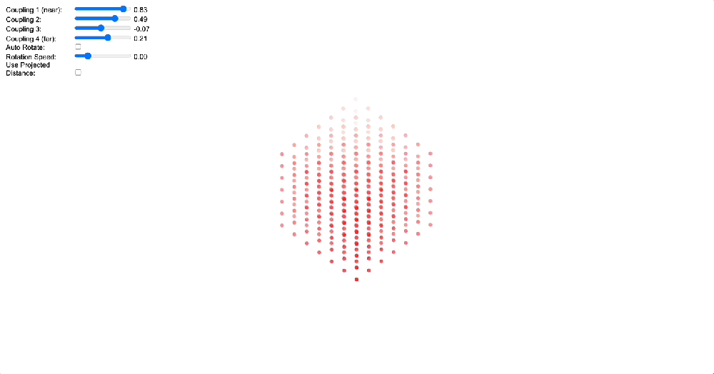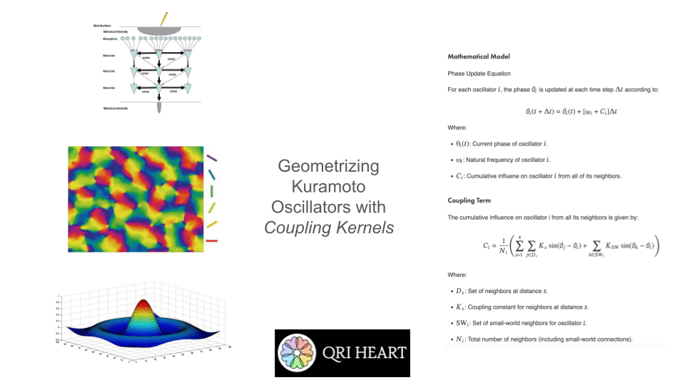 The core concept vis-à-vis QRI was introduced in Cessation states: Computer simulations, phenomenological assessments, and EMF theories (Percy, Gómez-Emilsson, & Fakhri, 2024), where we provided a novel conceptual framework to make sense of meditative cessations (i.e. brief moments at high levels of concentration where “everything disappears”). Coupling kernels was part of the conceptual machinery that allowed us to propose a model for cessations, but it is worth mentioning that it stands on its own as a neat tool that bridges low-level connectivity and high-level resonance in systems of coupled oscillators. The core concept is: in a system of coupled oscillators with a distance function for each pair of oscillators, a coupling kernel is a set of parameters that tells you what the coupling coefficient should be as a function of this distance. I independently arrived at this idea (which others have explored in the past to an extent) during the Canada HEART retreat in order to explain a wide range of phenomenological observations derived from meditative and psychedelic states of consciousness. In particular, we wanted to have a simple algorithmic reduction to be able to explain the divergent effects of DMT and 5-MeO-DMT: the former seems to trigger “competing clusters of coherence” in sensory fields, whereas the latter seems to pull the entire system to a state of global coherence (in a dose-dependent way). Thinking of systems of coupled oscillators, I hypothesized that perhaps DMT induces a sort of alternative coupling kernel (where immediate neighbors want to be as different as possible from each other, whereas neighbors a little further apart want to be similar) while 5-MeO-DMT might instantiate a general “positive kernel” where oscillators all want to be in phase regardless of relative distance. We are in the process of developing empirical paradigms to validate this framework, so please take this with a grain of salt; the paradigm is currently in early developmental stages, but it is nonetheless worth sharing for the reasons I mentioned already (bringing collaborators up to speed and getting the community to start thinking in this new way).