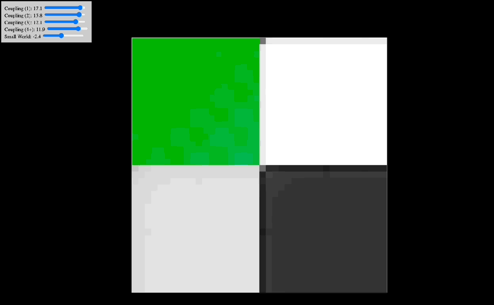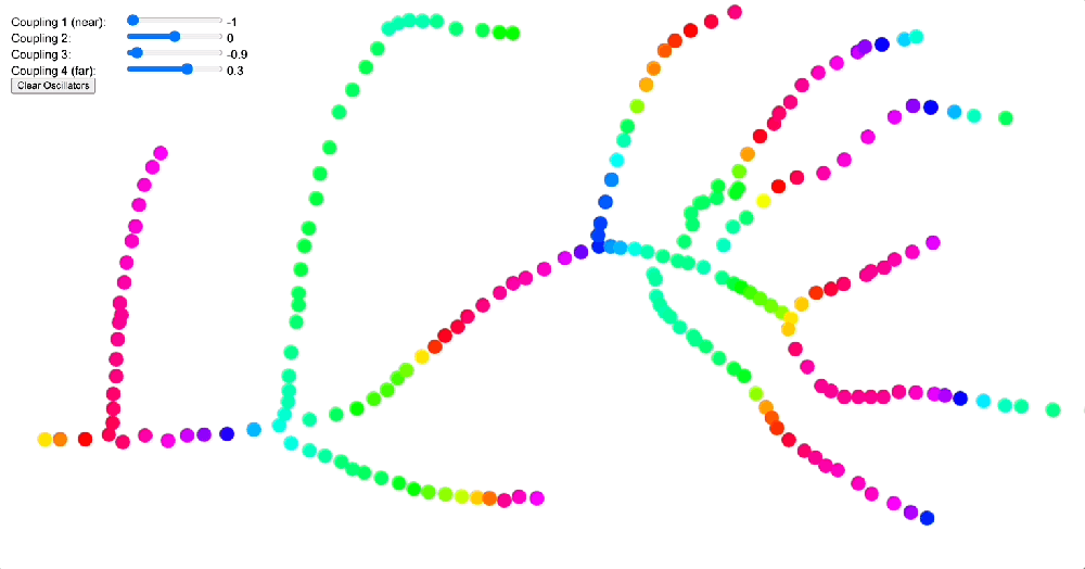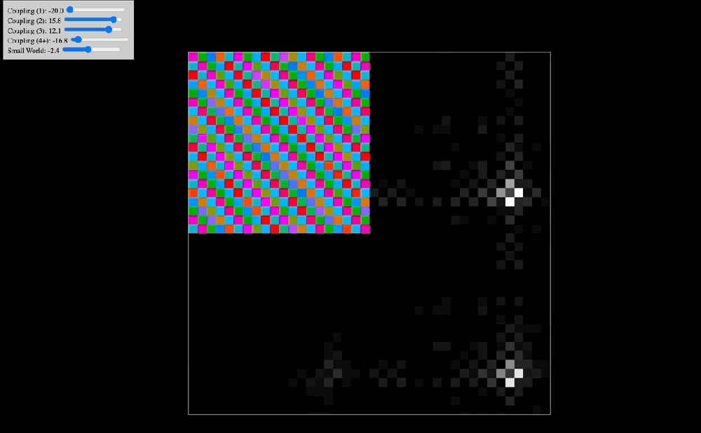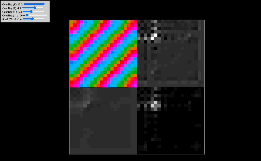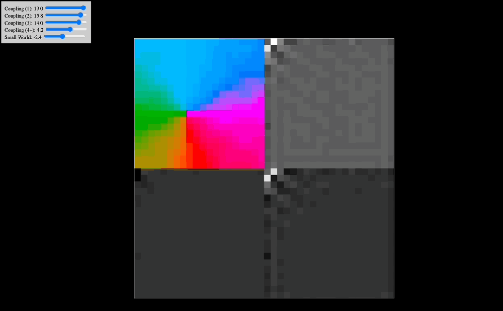 It is worth mentioning that in all of our simulations we also add a “small world” lever. The way this one is constructed is as follows: at the start of the simulation, for each oscillator we select two other oscillators at random and wire them to it. The lever controls the coupling constant between each oscillator and the two randomly chosen oscillators assigned to it. In graph theory, this kind of network architecture is often called a “small-world network” because the diameter of the graph quickly collapses as you add more random connections (and in our case, the system synchronizes as you add a positive coupling constant in for these connections). In practice, while the distance-based coupling kernel tunes into resonant modes (traveling waves, checkerboard patterns, etc. as we will see below), the small-world coupling constant adds a kind of geometric noise (when negative) and a global phase to which all oscillators can easily synchronize to (when positive). In effect, we suspect that small-world network-like neural wiring might be responsible for things like dysphoric seizures (due to high level of synchrony coupled with geometric irregularity causing intense dissonance) and disruption of consonant traveling waves (e.g. as a way to modulate anxiety). The phenomenology of being hungover or of experiencing benzo withdrawal might have something to do with an overactive negative small world network coupling constant.