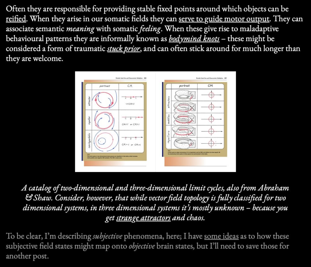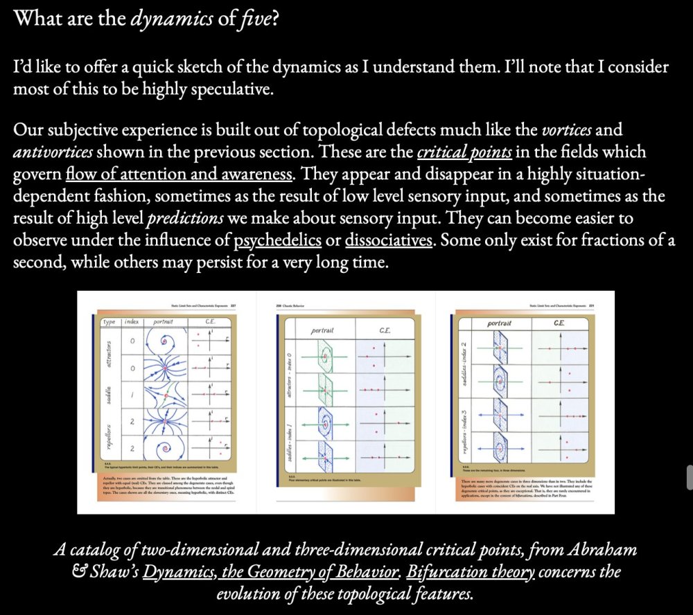 What’s particularly fascinating is that this framework suggests normal waking consciousness might represent a sweet spot of topological complexity. It carries enough structure to maintain a stable sense of self and world, but not so little as to dissolve completely (as in 5-MeO-DMT states). Each topological defect could be thought of as a kind of “perspectival anchor” in the field. As these defects systematically dissolve under 5-MeO-DMT, we would expect exactly what subjects report: a progressive loss of distinct perspectives culminating in a state of pure unity. Perhaps sleep and dreaming could be also interpreted through this lens: during periods of wakefulness we slowly but surely accumulate topological defects; sleep and dreaming might be a process of topological simplification where the topological defects aggregate and cancel out. Notice next time you find yourself in a hypnagogic state how it feels like to “let go of the central grasping to experience” and the subsequent fast “unraveling” of the field of experience. Much more to say about this in the future (a topological simplification theory of sleep).