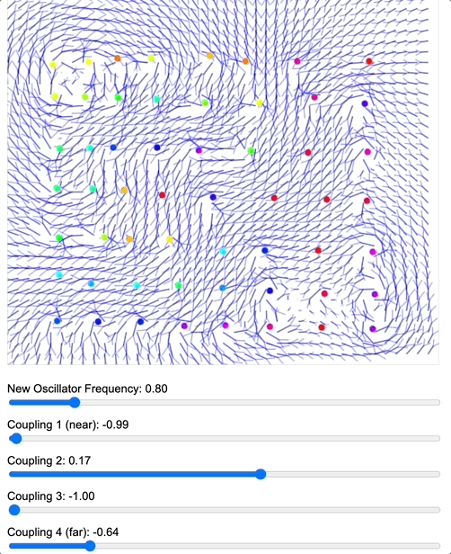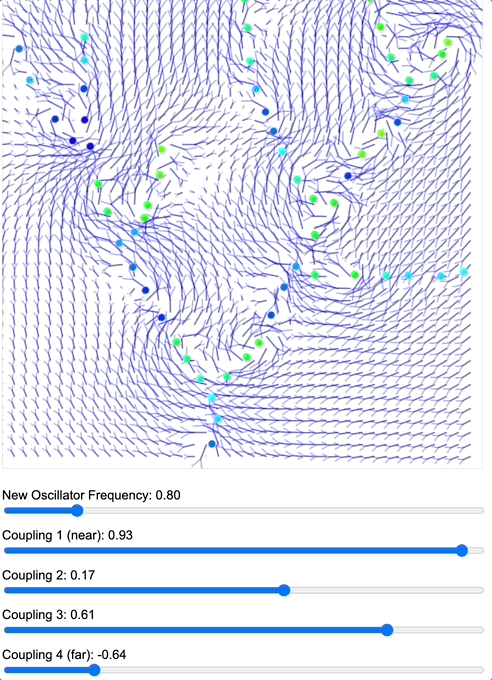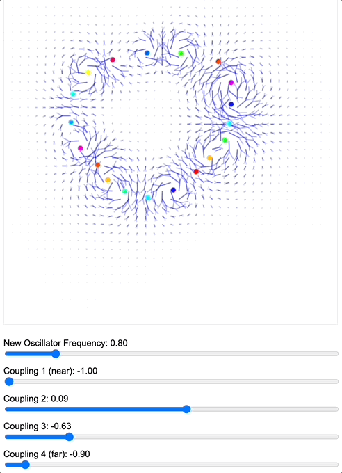 This post aims to communicate a simple yet powerful idea: if you have a system of coupled oscillators controlled by a coupling kernel, you can use it to not only “tune into resonant modes” of the system, but also as a point of leverage to control the topological structure of the fields interacting with the oscillators.