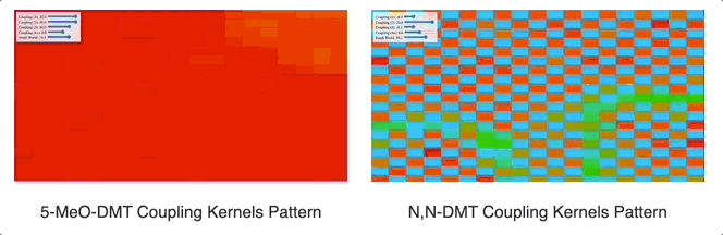 Simulation comparing coupling kernels across a hierarchical network of feature-selective layers (16×16 to 2×2), showing how different coupling coefficients between and within layers affect pattern formation. The DMT-like kernel (-1.0 near-neighbor coupling) generates competing checkerboard patterns at multiple spatial frequencies, while the 5-MeO-DMT-like kernel (positive coupling coefficients) drives convergence toward larger coherent patches. These distinct coupling dynamics mirror how these compounds might modulate hierarchical neural architectures like the visual cortex.