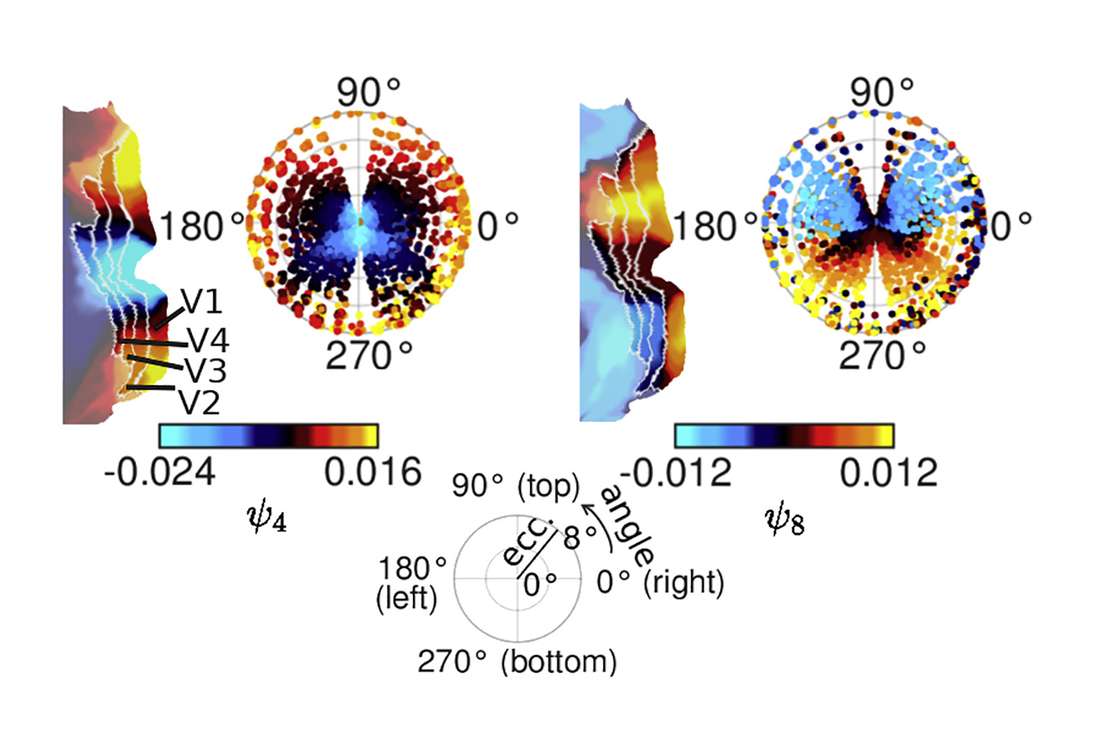 Retinotopies of functional harmonics 4 and 8. Each panel shows, on the right, the colors of the respective functional harmonic in early visual areas V1–V4 on a polar plot of eccentricity (distance in degree from the fovea) and angle on the visual field (see legend at the bottom of the figure). On the left, the respective functional harmonic is shown on a flat map of early visual cortex (left hemisphere). V1, V2, V3, and V4: visual areas 1, 2, 3, and 4.