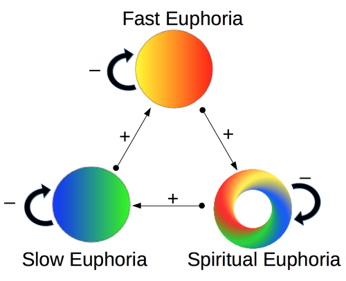 This is perhaps the most common exotic phenomenal time experience that people have on psychedelics and dissociatives. This is due to the fact that, while it can be generated spontaneously, it is relatively easy to trigger by listening to repetitive music (e.g. a lot of EDM, trance, progressive rock, etc.), repetitive movements (e.g. walking, dancing), and repetitive thoughts (e.g. talking about the same topic for a long time) all of which are often abundant in the set and setting of psychedelic users. The effect happens when your projections about the future and the past are entirely informed by what seems like an endlessly repeating loop of experience. This often comes with intense emotions of its own (which are unusual and outside of the normal range of human experience), but it also triggers secondary emotions (which are just normal emotions amplified) such as fear and worry, or at times wonder and bliss. The pseudo-time arrow model of phenomenal time describes this experience as a graph in which the local patterns of implicit causality form a cycle at the global scale. Thus the phenomenal past and future merge at their tails and one inhabits an experiential world that seems to be infinitely-repeating.